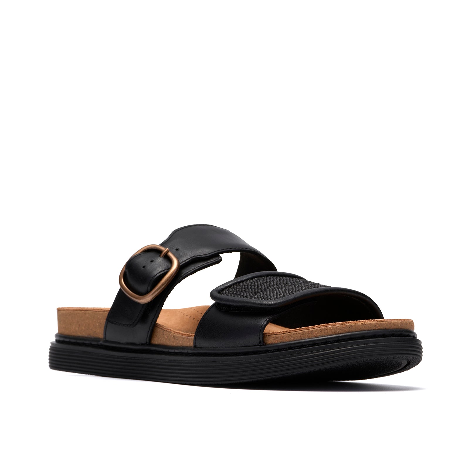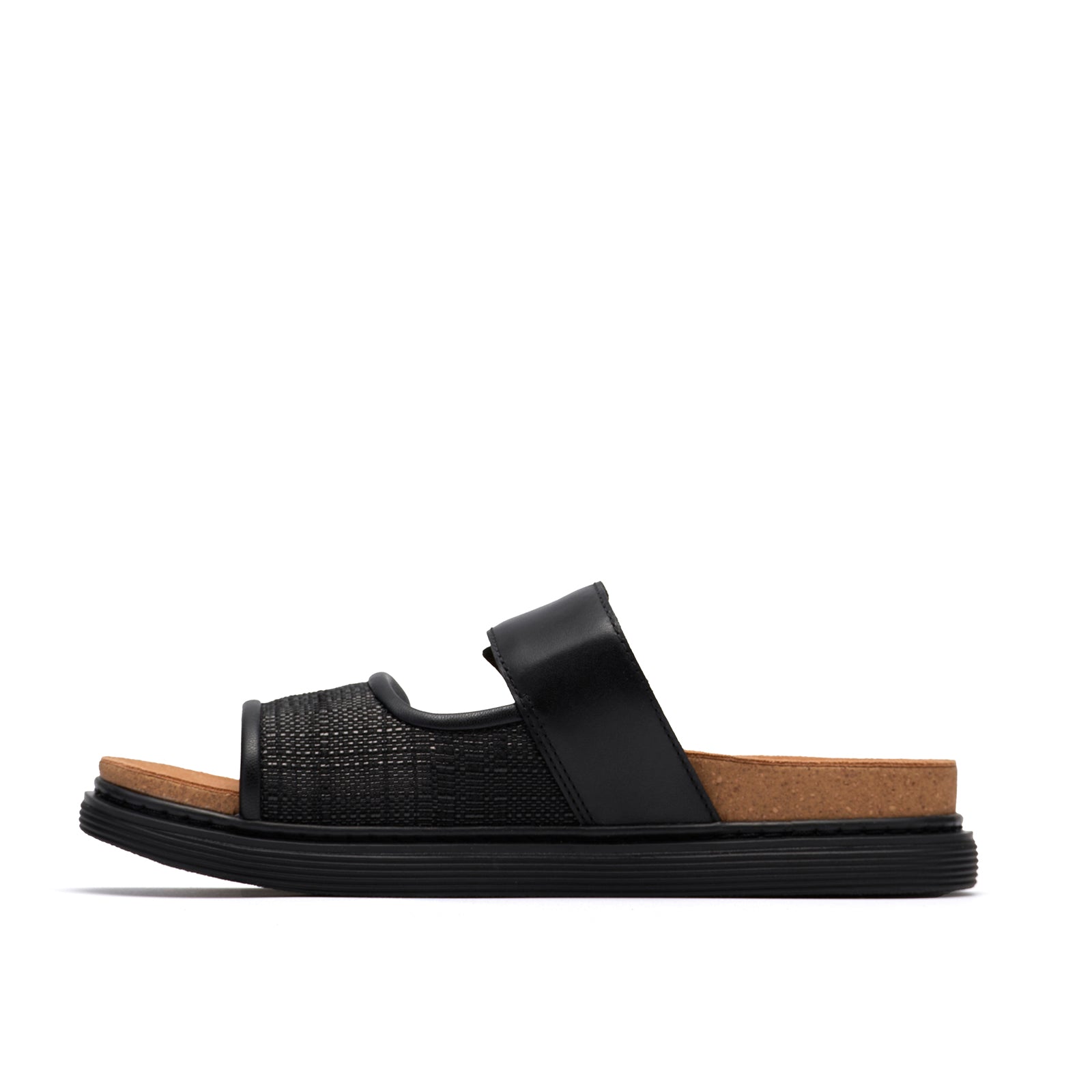 • Premium black leather upper with raffia detailing on the front strap
